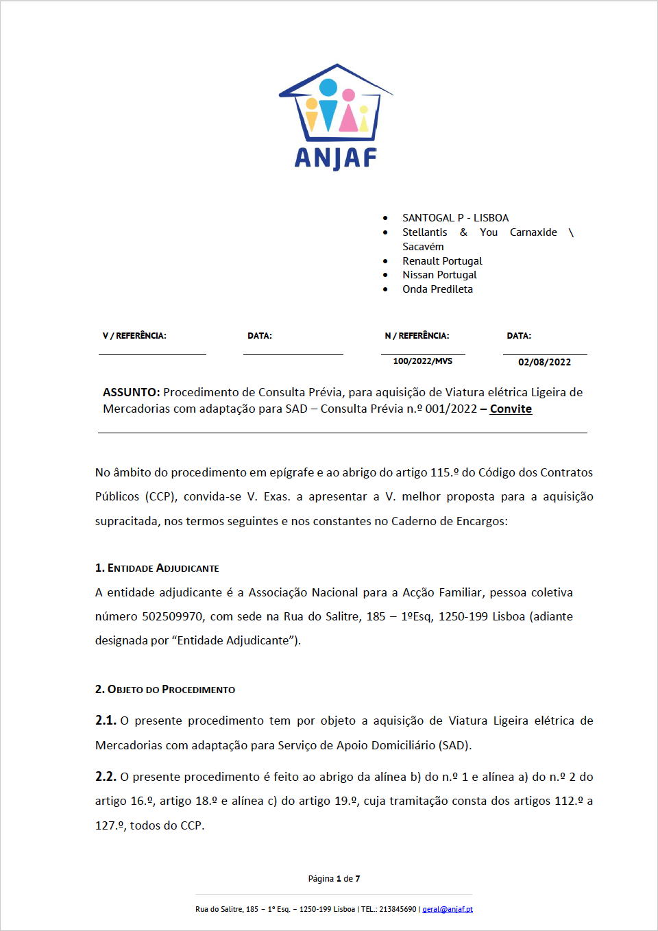 É com satisfação que informamos da realização de uma Consulta Prévia para a Aquisição de Viatura Ligeira Elétrica de Mercadorias com Adaptação a Serviço de Apoio Domiciliário, no âmbito do INVESTIMENTO RE-C03-I01 – NOVA GERAÇÃO DE EQUIPAMENTOS E RESPOSTAS SOCIAIS N.º 01/C03-I01/2021 RE-C03-I01.M04 – MOBILIDADE VERDE SOCIAL – AQUISIÇÃO DE VEÍCULOS ELÉTRICOS, promovida pela Associação Nacional para Ação Familiar (ANJAF).