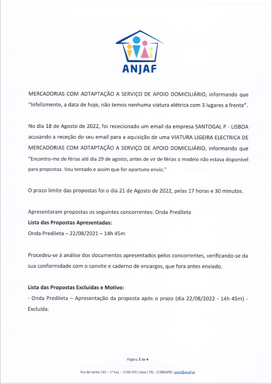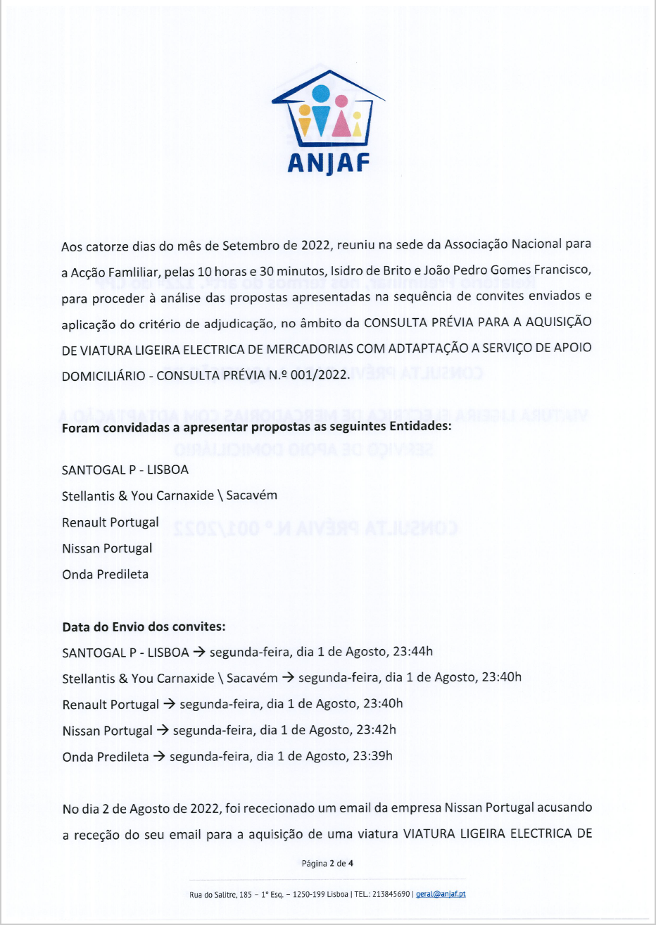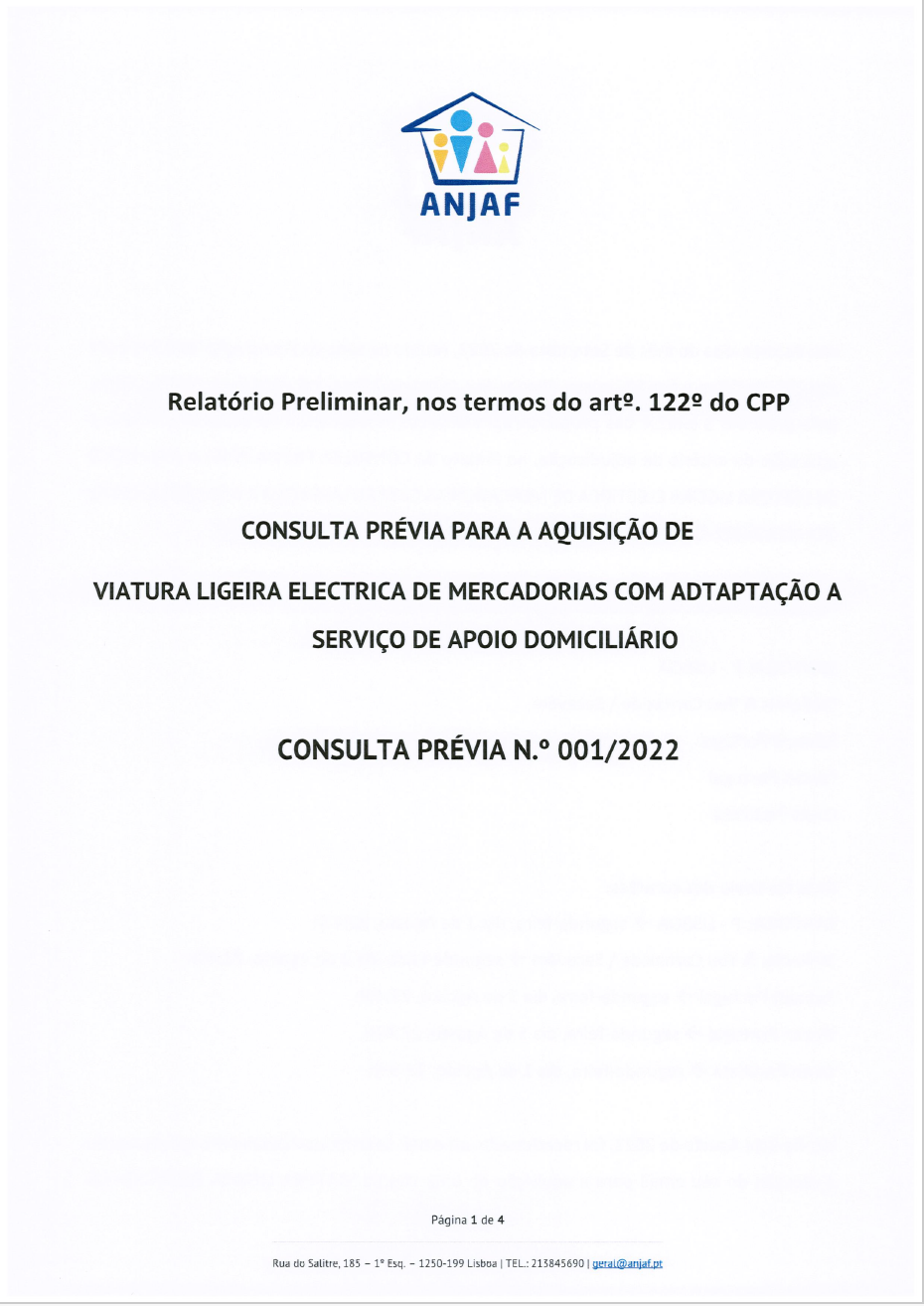 Relatório Preliminar, nos termos do art. 122º do CPP relativo à Consulta Prévia n.º 001/2022 A AQUISIÇÃO DE VIATURA LIGEIRA ELECTRICA DE MERCADORIAS COM ADAPTAÇÃO A SERVIÇO DE APOIO DOMICILIÁRIO, no âmbito do INVESTIMENTO RE-C03-I01 – NOVA GERAÇÃO DE EQUIPAMENTOS E RESPOSTAS SOCIAIS N.º 01/C03-I01/2021 RE-C03-I01.M04 – MOBILIDADE VERDE SOCIAL – AQUISIÇÃO DE VEÍCULOS ELÉTRICOS